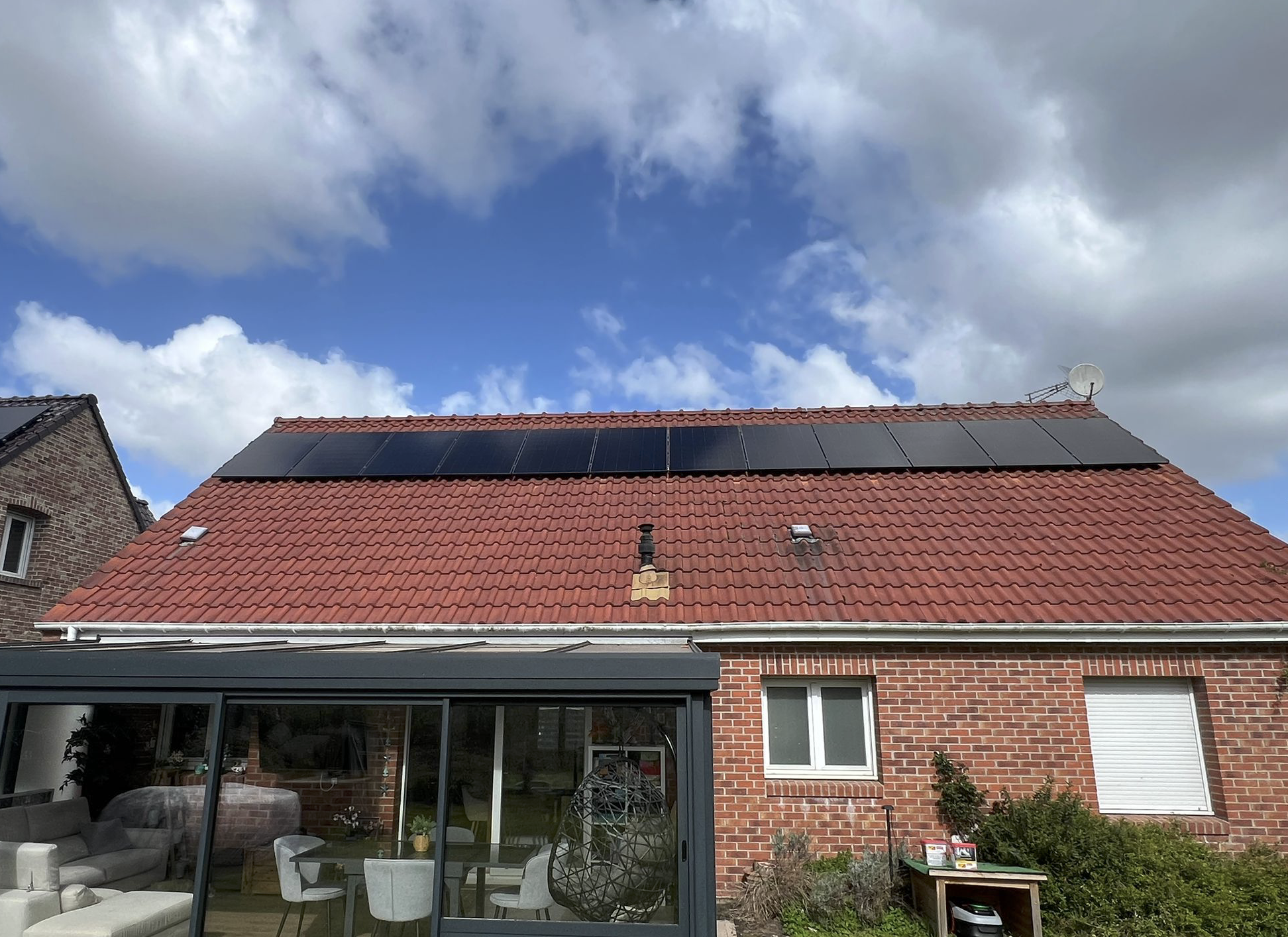 Malgré la complexité du chantier (toiture inclinée à 45° et calepinage en 3 lignes de 4 panneaux), le résultat est parfait tout est aligné bravo !